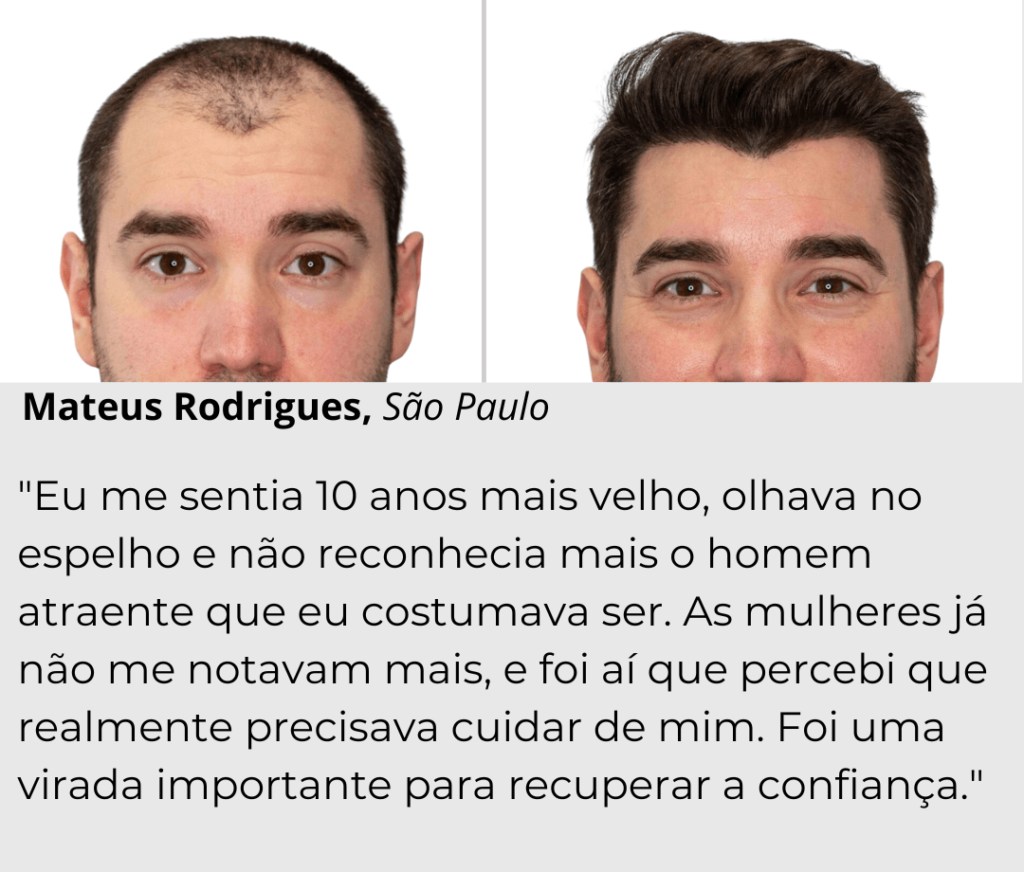 Para Marcos, observar as falhas no cabelo e a falta de volume desaparecerem foi incrível. No entanto, ele destaca que a melhor sensação é a de se sentir mais confiante; não ter vergonha de frequentar lugares onde antes se sentia deslocado. Para ele, a autoestima elevada não há preço que pague.