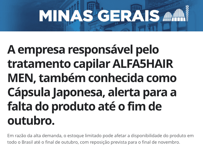 A empresa responsável pelo tratamento capilar ALFA5HAIR MEN, popularmente conhecido como Cápsula Japonesa, emitiu um alerta sobre a possível falta do produto até o fim de outubro. Devido à alta demanda, o estoque está se esgotando rapidamente em todo o Brasil. A reposição está prevista apenas para o final de novembro, o que pode gerar escassez temporária no mercado. Para quem busca combater a calvície com essa solução inovadora, a recomendação é garantir o tratamento o quanto antes.