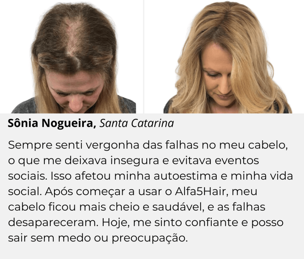 Sou professora e meus alunos sempre me perguntavam por que eu não tinha tanto cabelo quanto as mães deles, o que me deixava muito mal. Isso me fez perceber que eu realmente precisava procurar ajuda. Há cerca de oito meses, duas amigas dermatologistas me falaram sobre essa cápsula. Elas estavam ansiosas pela chegada desse tratamento e me garantiram que o produto realmente atua na enzima, sendo diferente de qualquer outro disponível no mercado. Elas acabaram de me enviar a matéria, e eu já adquiri meu kit.